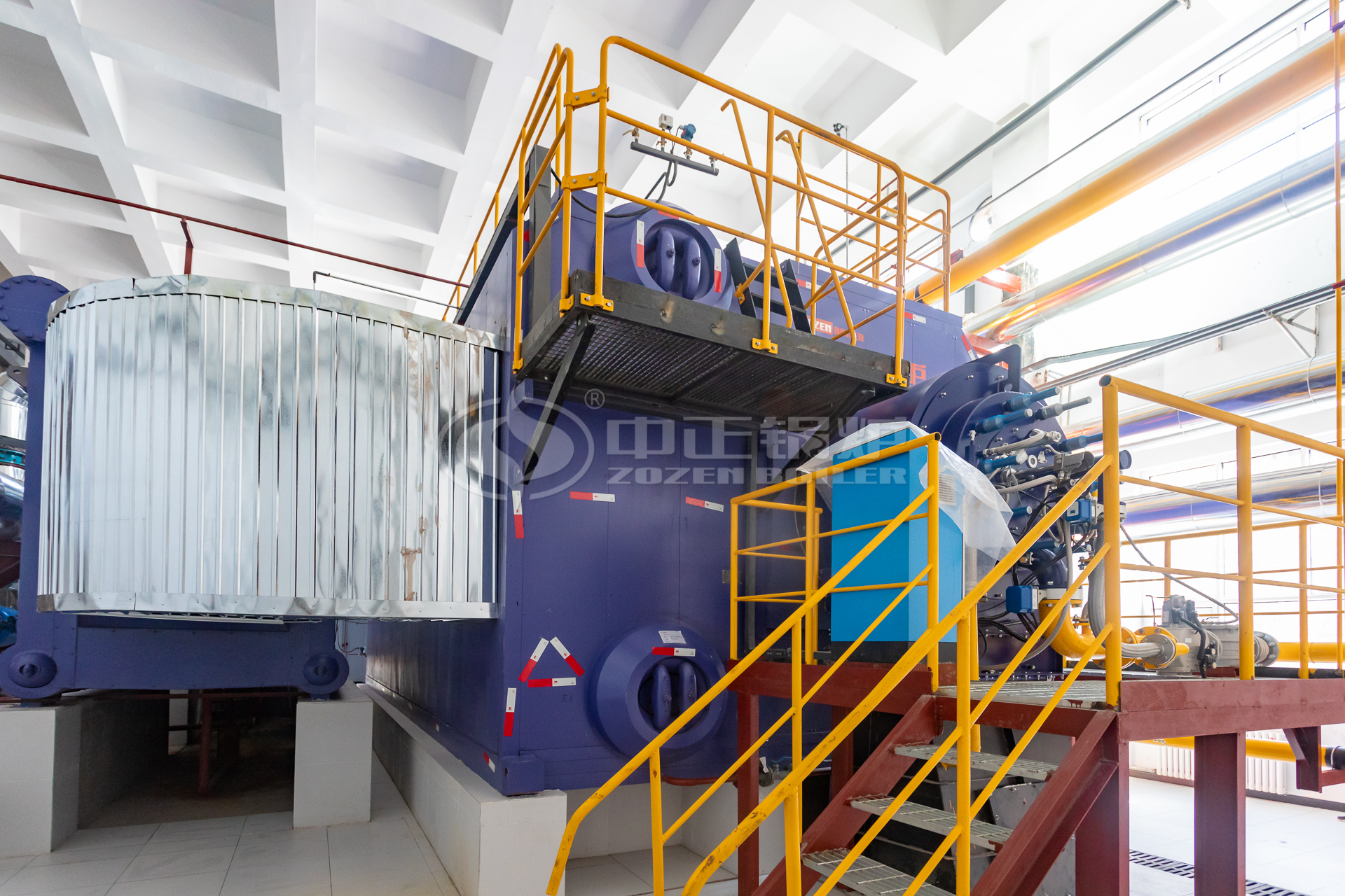 SZS boiler body is the structure of longitudinal double drums and D-type chamber combustion. The furnace is on right side and the convection tube bundle are on left side. The flexible supports of boiler are in the middle and two ends of the lower drum, and it can secure the whole boiler body to expand sideways. There are narrow-space membrane cooling tube walls on the four sides of furnace. The left membrane wall makes the furnace and the convection tube bundle separated. The rear of convection tube bundle is a kind of tube-decreasing and staggered structure, and the front is an aligned structure. The flue gas generated from furnace combustion flows from the rear outlet of furnace into the end of combustion chamber, convection tube bundle area, and then turns from the front-left of furnace to the spiral finned tube economizer, and next flows into smoke duct and chimney and finally exhausts into atmosphere.