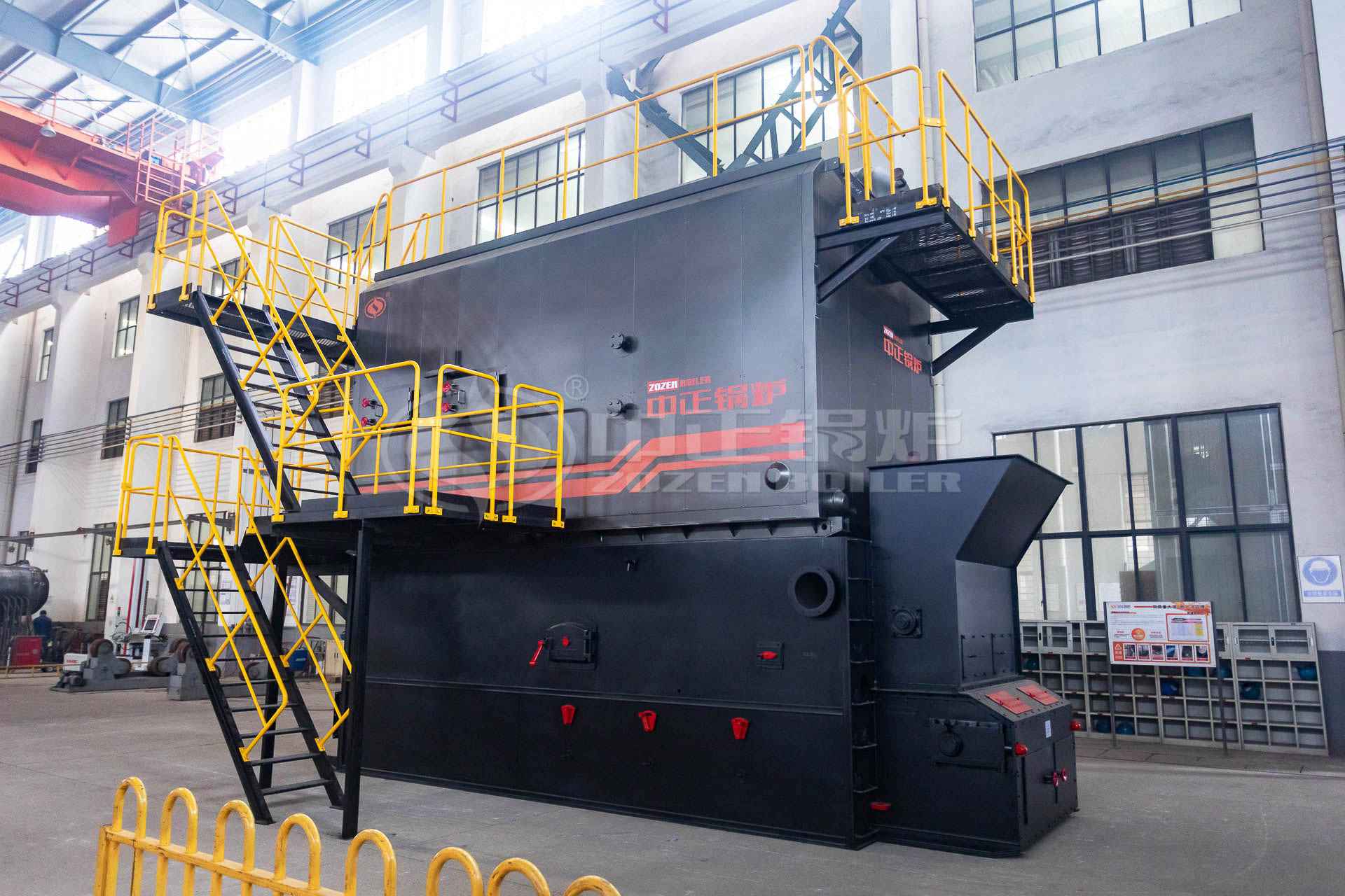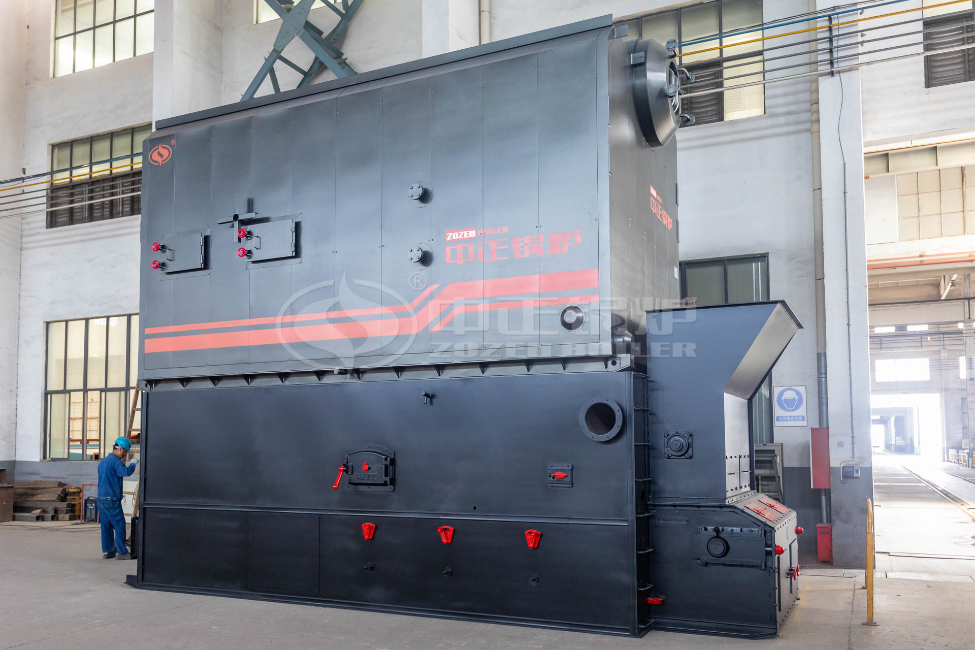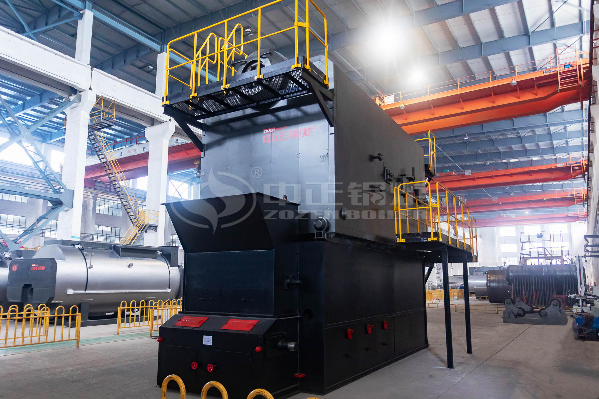 SZL series biomass-fired chain grate boilers are safe and efficient, with capacity from 4t/h to 35t/h (hot water: 2.8-29MW). ZOZEN has taken the lead in solving the problems commonly occurred in conventional biomass-fired boilers, such as furnace arch burning down, furnace door burnout, backfire in hopper tempering and tube shell coking. The boiler has features of wide fuel adaptability, small occupied area, convenient installation and high thermal efficiency.